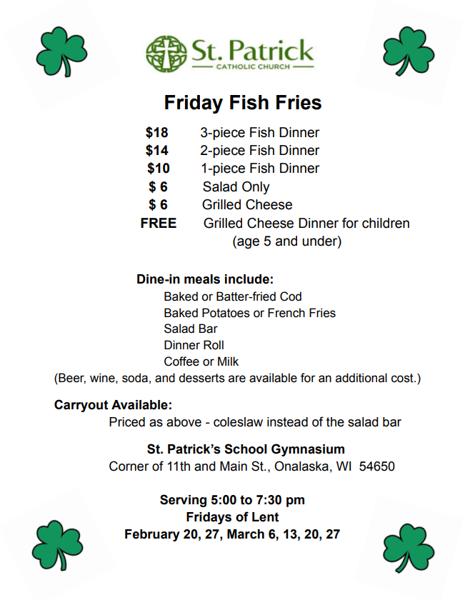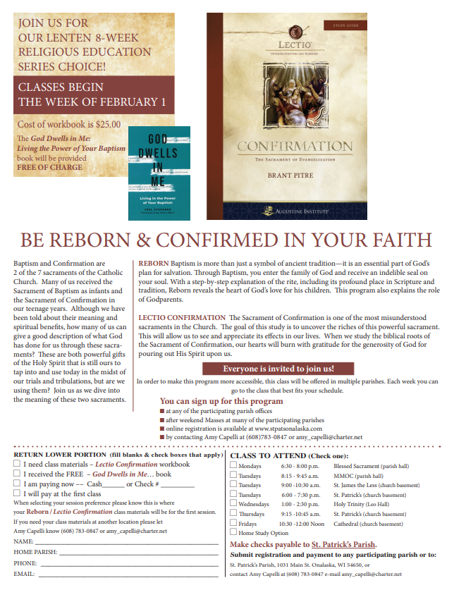 For the religious education calendar for the year, please contact our Director of Religious Education, Anne, at dre@stpatsonalaska.com.